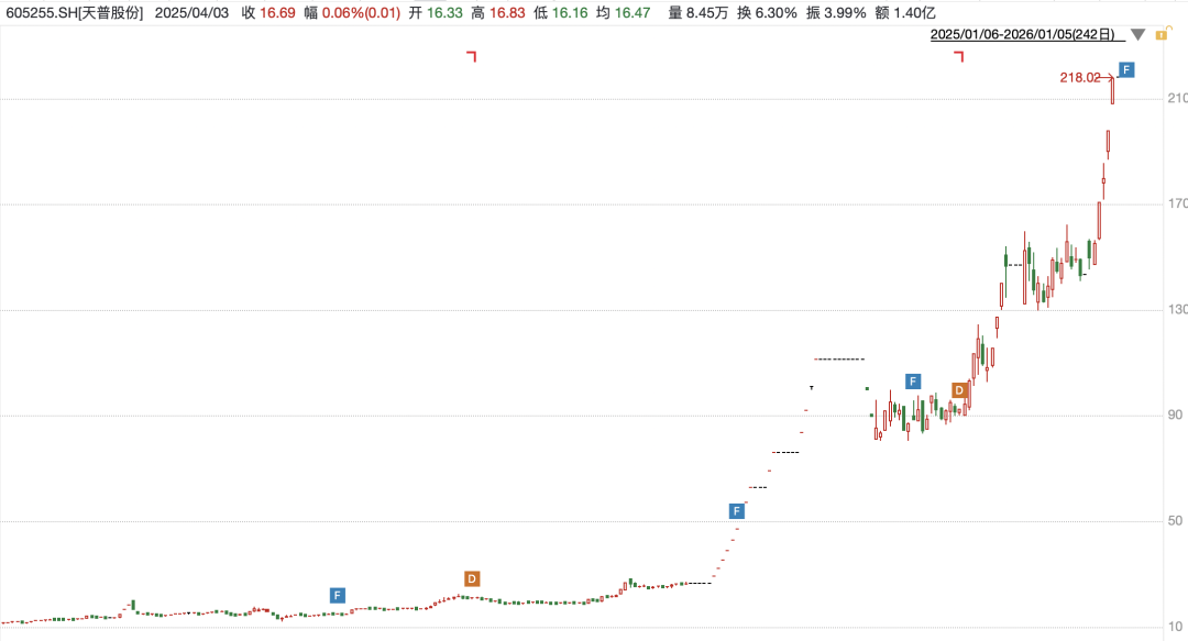 盘面上,2025年,公司股价从年初12.59元/股涨至年末的218.02元/股,累计涨幅达1645.35%。